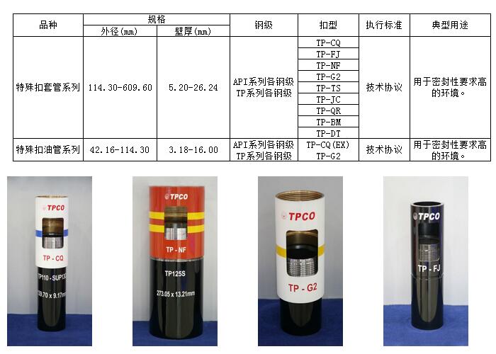 天津大無縫鋼管廠開發的抗擠毀系列套管具有比API Spec 5CT同規格、同鋼級套管更高的抗擠毀性能,適用于鹽膏層、泥巖層以及油層出砂等特殊井況,抵抗極大外擠載荷或不均勻外擠載荷。TP系列高抗擠毀套管包括三個種類,一是API Spec 5CT標準規格系列的高抗擠毀套管;二是具有特殊通徑要求的API Spec 5CT規格高抗擠毀套管;三是適用于巖鹽層、鹽膏層、泥巖層等復雜井況的非API規格系列的超高強度高抗擠毀套管。